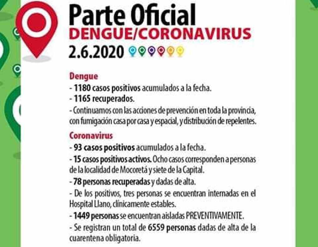 El parte oficial epidemiológico de la provincia indica, que no hay nuevos casos de coronavirus este lunes 1 de junio. Permanecen internadas tres personas en el Hospital Llano clínicamente estables y, se acumulan a la fecha 93 casos de COVID-19.