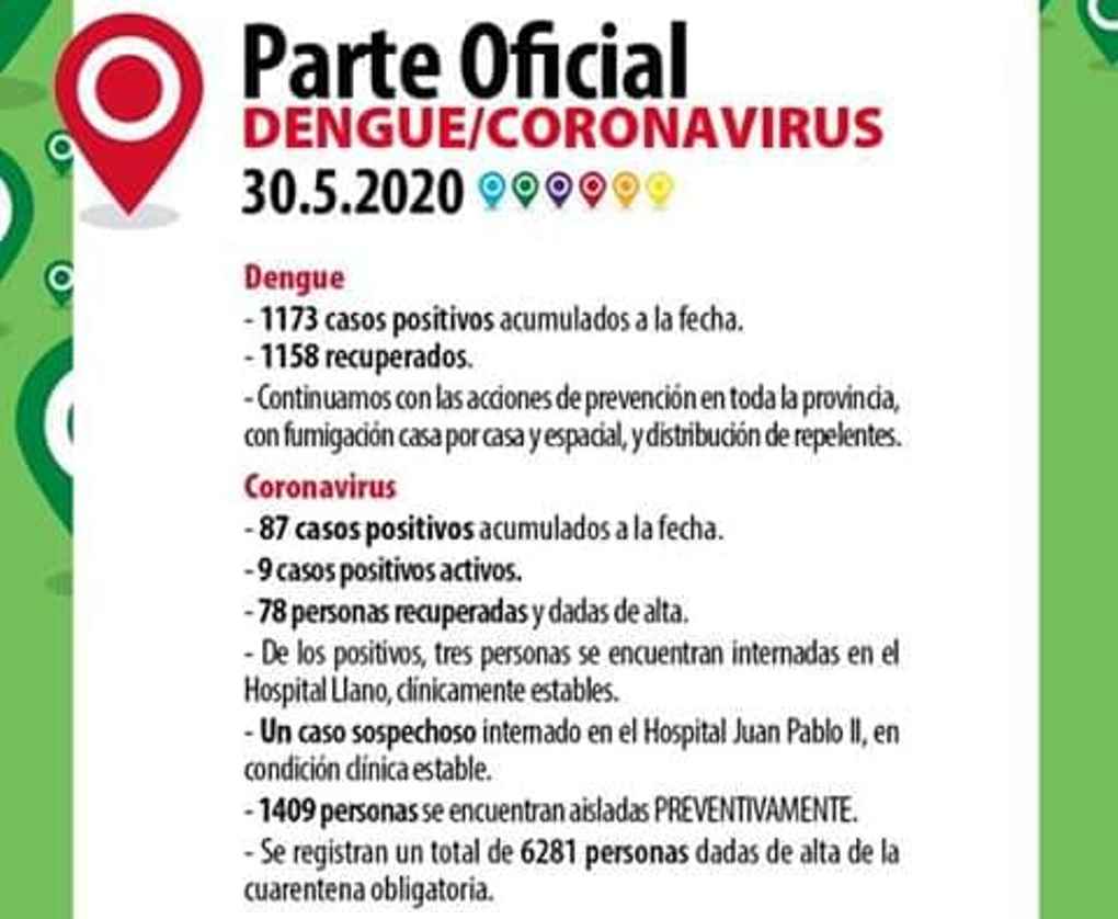 El informe epidemiológico de este sábado reveló que tras siete casos, que se dieron a conocer ayer, no hubo nuevos contagios de coronavirus. El acumulado de positivos se mantiene en 87, de los cuales 78 se han recuperado y fueron dados de alta, mientras que 9 continúan activos.