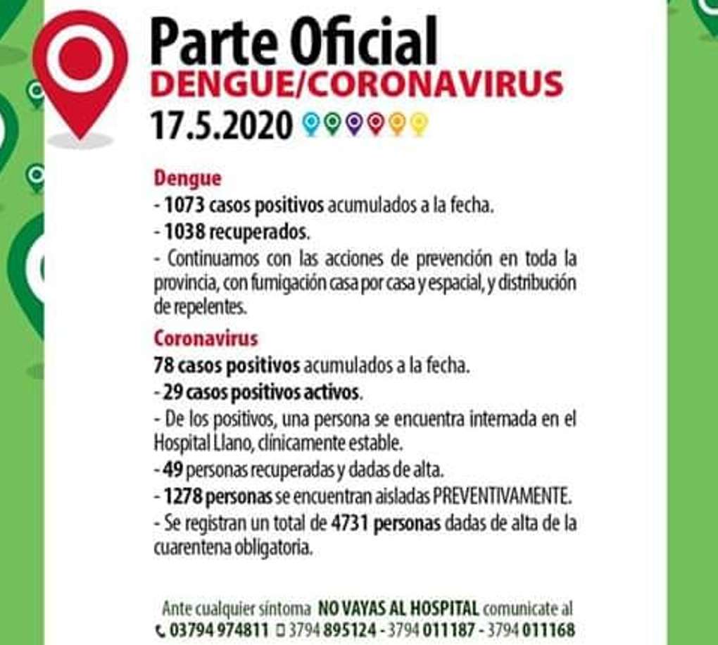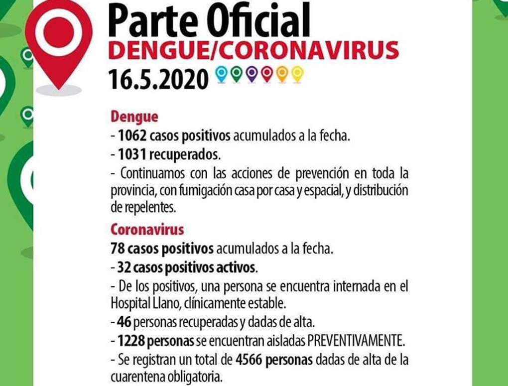 El parte oficial del día de la fecha, sábado 16 de mayo, indica que no se registraron nuevos casos de Coronavirus en Corrientes. Se acumulan a la fecha 78 positivos de los que 46 personas ya se recuperaron y fueron dados de alta.