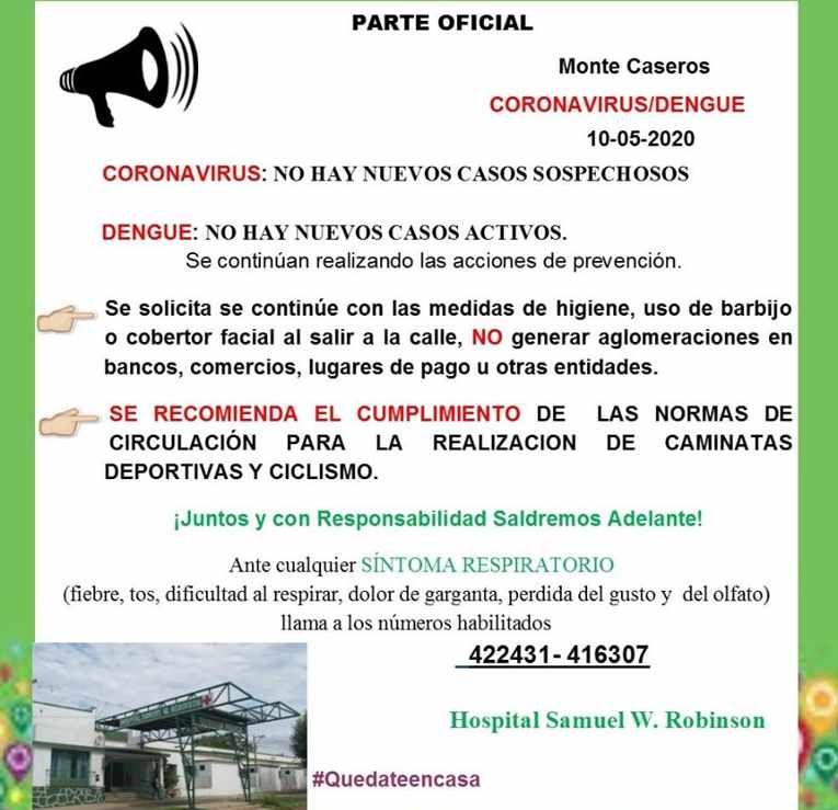 Desde la Dirección del Hospital Samuel W Robinson informaron mediante un parte oficial la situación epidemiológica del Coronavirus y Dengue en la ciudad de Monte Caseros, la misma se mantiene y en el día de la fecha confirman que No hay casos sospechosos de coronavirus en la ciudad y que tampoco se encuentran personas aisladas preventivamente. Además, aseguraron que No hay nuevos casos activos de dengue.