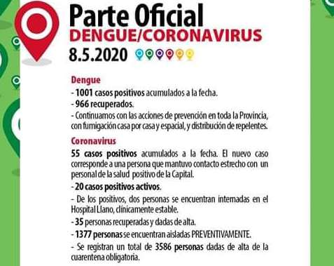 El parte oficial de hoy, viernes 8, indica que se confirmó un nuevo caso positivo, proviene de contacto estrecho con personal de salud positivo de la Capital, Se acumulan a la fecha 55 casos positivos de las que 35 personas se han recuperado y fueron dadas de alta. En cuanto al dengue la cifra a la fecha es de 1001 positivos de los cuales 966 se han recuperado.