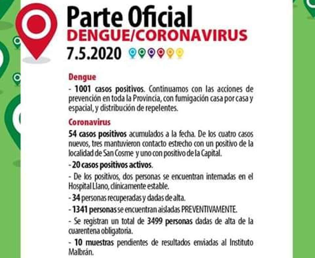 El parte oficial de este jueves 7 de mayo, detalla que se registraron 4 nuevos casos positivos, tres provienen de contacto estrecho con un positivo de la localidad de San Cosme, se encuentran aislados y en buen estado clínico. El otro caso corresponde a la capital correntina A la fecha se acumulan 54 casos positivos.En cuanto al dengue la cifra superó los mil contagiados.