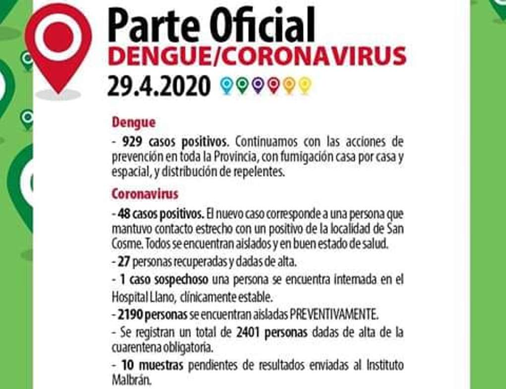 El parte oficial del día de la fecha indica que hay un nuevo caso positivo de Coronavirus en Corrientes. Se trata de una persona con contacto estrecho con el positivo de San Cosme. Ya son 48 los casos positivos en la provincia y se han recuperado 27 personas que fueron dadas de alta. Mientras que el Dengue la cifra de infectados ascendió a 929.