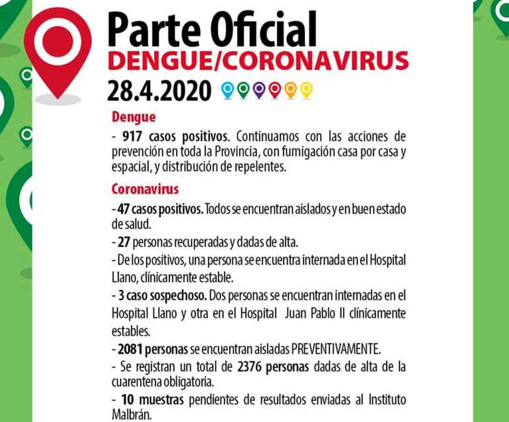 El parte oficial del día de la fecha detalla que en las ultimas 24 horas no se registraron nuevos casos de Coronavirus, La cifa continúa en 47 positivos. Por otro lado, se han recuperado y fueron dados de alta 27 personas. En cuanto al dengue Corrientes 917 casos.
