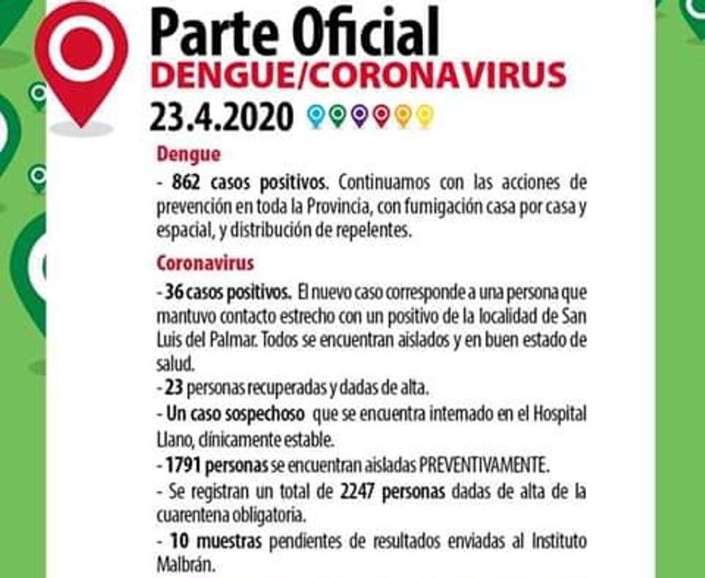La provincia de Corrientes registra 36 casos positivos. El nuevo corresponde a una persona que mantuvo contacto estrecho con un positivo de la localidad de San Luis del Palmar. Se encuentra aislado y estable clínicamente. Se han recuperado 23 pacientes, quienes fueron dados de alta. Esperan el resultado de 10 muestras enviadas al Instituto Malbrán.