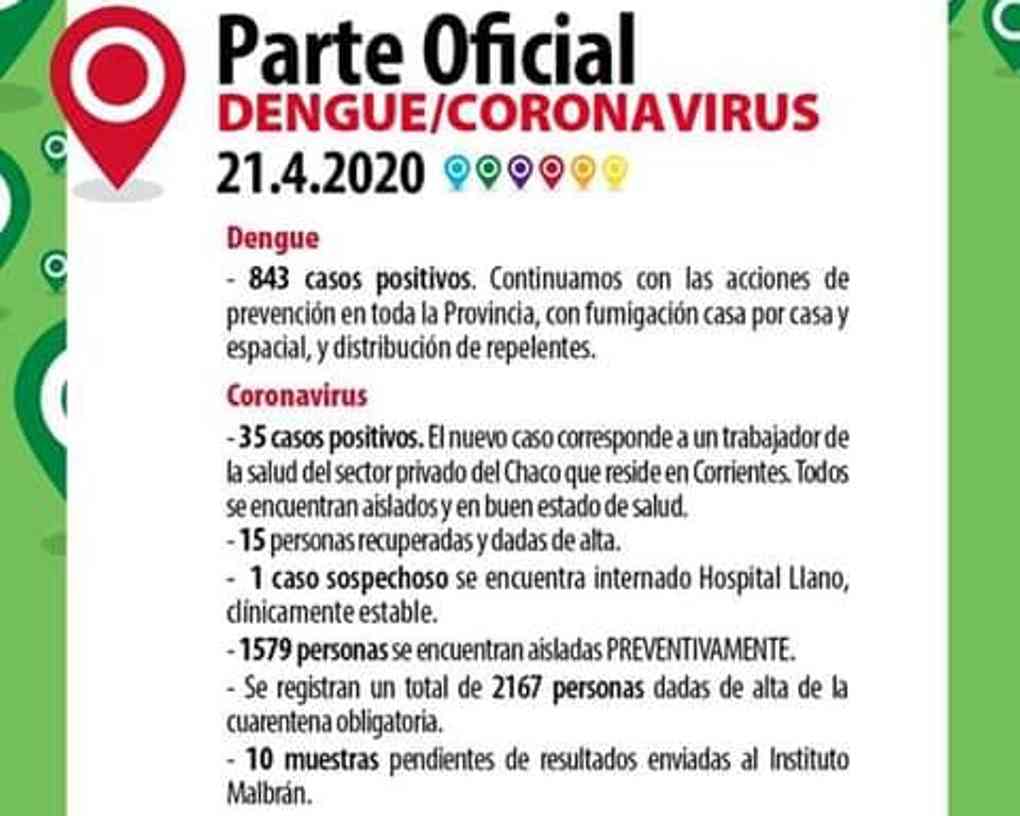 Se registró un caso positivo nuevo de Coronavirus, se trata de un trabajador del sector privado de la salud del Chaco, se encuentra estable clínicamente. Se acumulan a la fecha 35 positivos de COVID-19 y 10 nuevos de dengue sumando un total de 843 en la provincia.