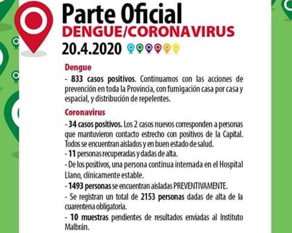 Confirmaron 2 nuevos casos de COVID-19 y 10 nuevos casos positivos de Dengue en Corrientes