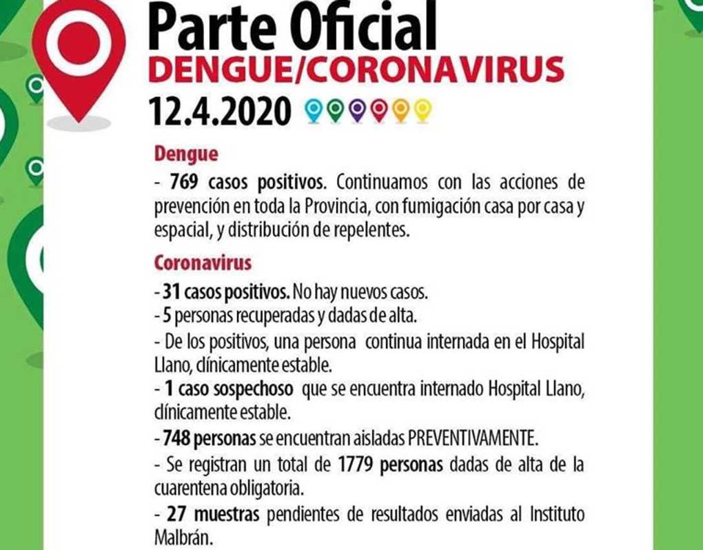 El informe epidemiológico de la fecha consigna que no hubo nuevos casos positivos de Coronavirus en la Provincia, y que con la recuperación de cinco personas que recibieron el alta, quedan 26 en esa condición. Se encuentran 711 personas en aislamiento preventivo y fueron dados de alta otras 1898, continúan internadas dos personas en sala general del Llano, se trata de un positivo y un caso sospechoso ambos se muestran estables clínicamente, aún prosiguen sin conocerse los resultados de 27 muestras enviadas al Instituto Malbrán.