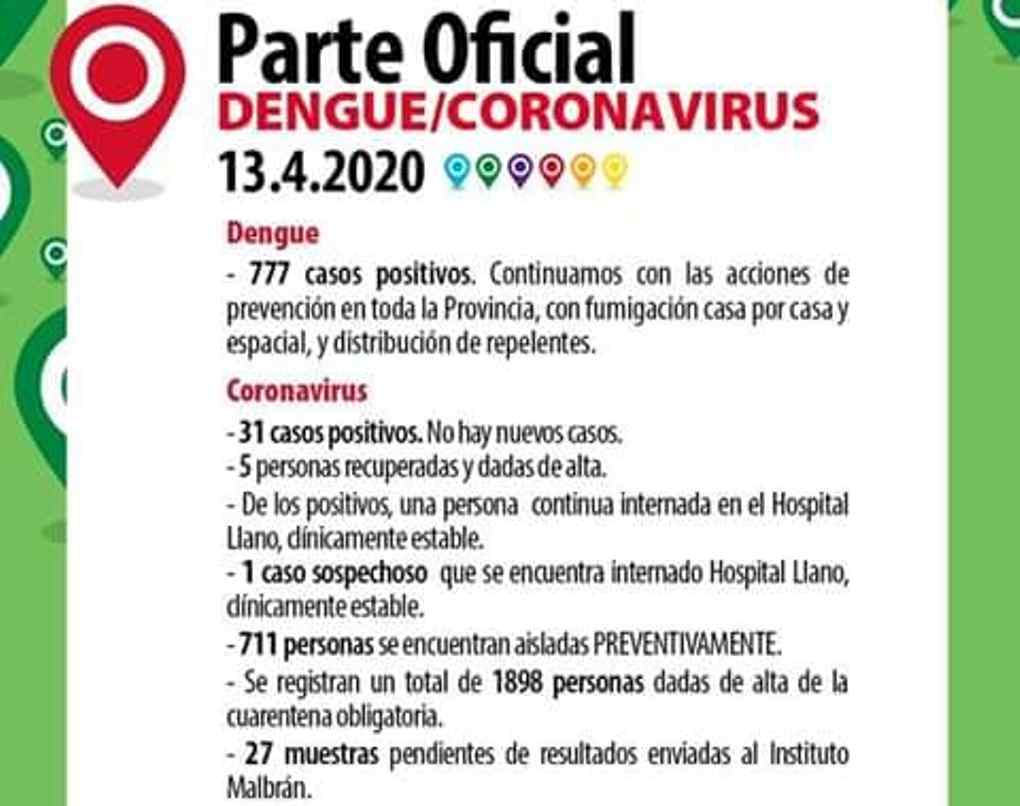El informe epidemiológico de la fecha consigna que no hubo nuevos casos de Coronavirus en el territorio correntino, por lo que el acumulado se mantiene en 31, en tanto cinco personas que se encontraban en esta condición se recuperaron y recibieron el alta definitiva. Continúan internadas dos personas, un positivo y un caso sospechoso, ambos en sala general del Llano, quienes se encuentran estable clínicamente.