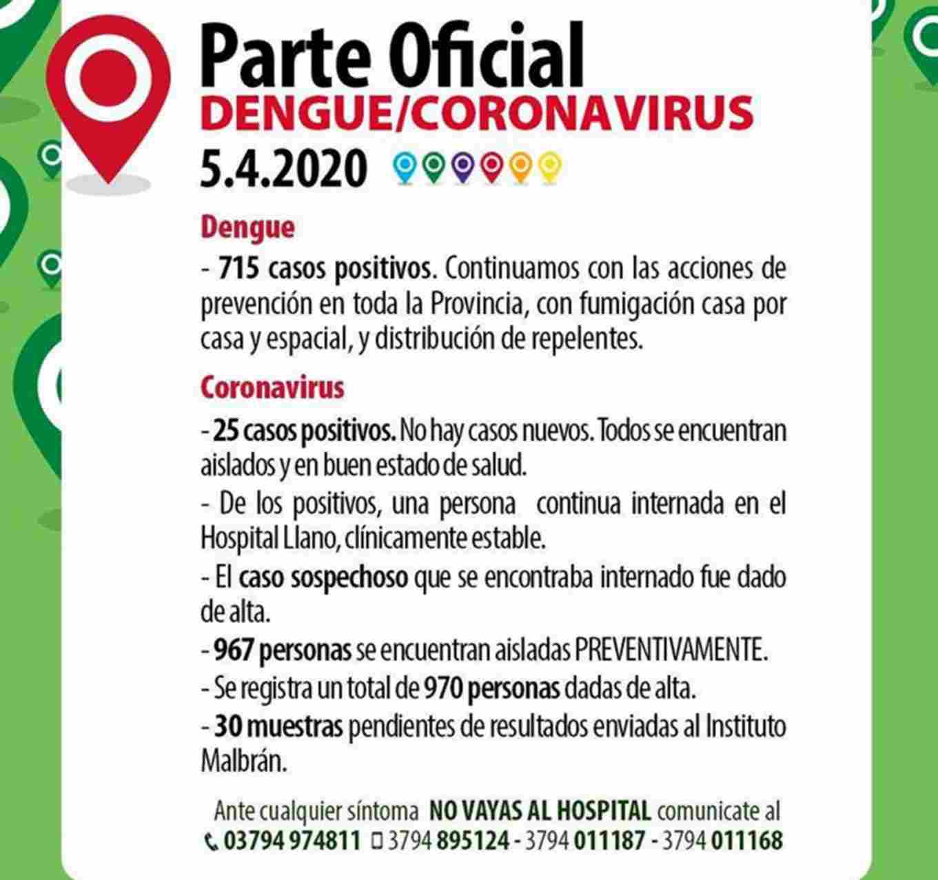 En el parte oficial que cada día emiten desde el Gobierno de Corrientes, se dio a conocer que son 25 casos de Coronavirus y 707 de Dengue en la Provincia.