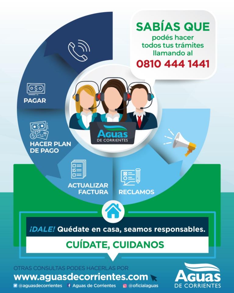 Ante el cierre de las oficinas comerciales como consecuencia de la cuarentena obligatoria, Aguas de Corrientes informó, a través de sus redes sociales oficiales, que sus clientes pueden realizar trámites desde su casa mediante vías telefónicas y digitales.