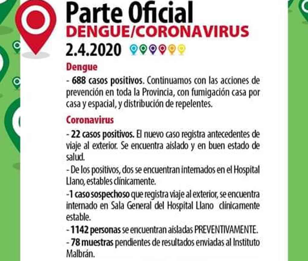 Hay a la fecha 22 casos positivos de Coronavirus en la provincia, uno de ellos se encuentra internado en sala general en el Hospital Llano, otro en la Unidad de Terapia Intensiva del mismo centro de Salud, ambos están estable clínicamente. El caso nuevo tiene antecedente de viaje al exterior, se encuentra aislado y en buena condición clínica. En aislamiento preventivo se encuentran 1142 personas y esperan el resultado de 78 muestras enviadas el Instituto Malbrán.Las altas acumuladas son 585.