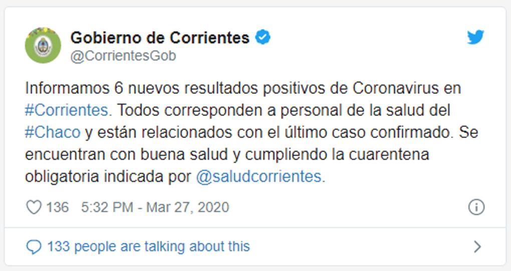 Int. General | Hoy se registraron 87 nuevos casos y el número de contagiados es de 589. Dos de los fallecidos se registraron en la provincia de Buenos Aires, uno en la Capital Federal y uno en Chaco.
