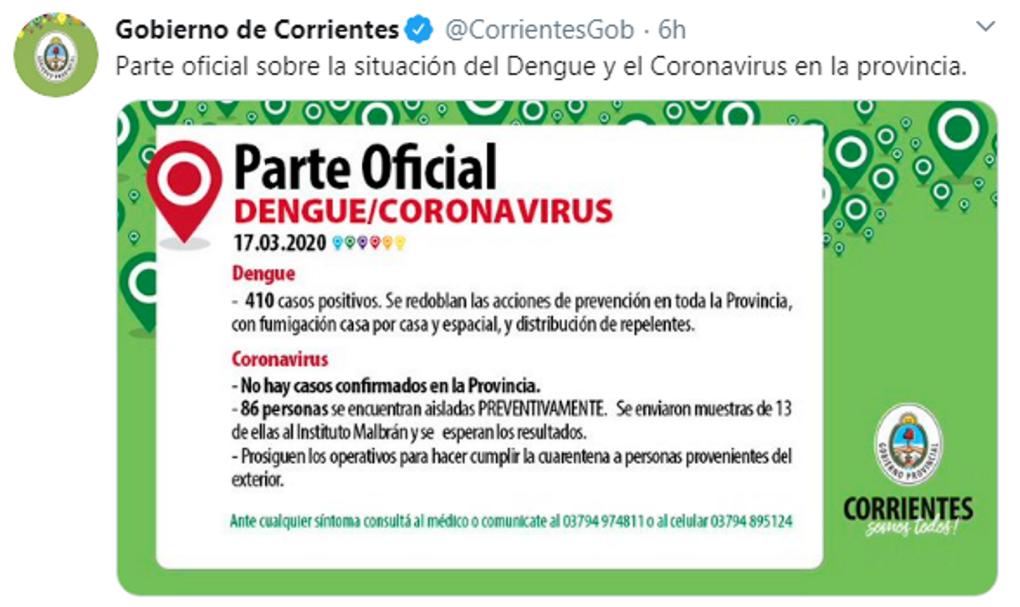 El Gobierno de Corrientes informó que ya son 13 los análisis enviados para poder confirmar o descartar casos de coronavirus en Corrientes. Se trata de un aumento de 3.