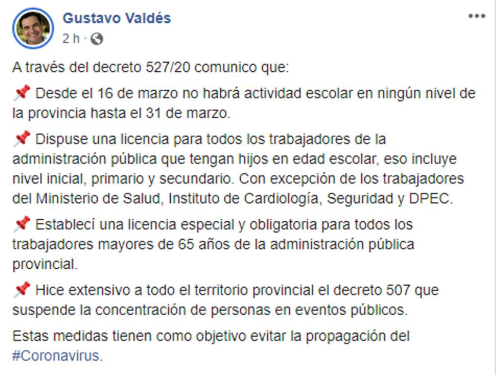A través de su cuenta de Twitter el Gobernador de la Provincia, Dr. Gustavo Valdés confirmó que a raíz de lo anunciado por el Presidente de la Nación, en la Provincia de Corrientes, a partir de este lunes 16, no habrá actividad escolar en ningún nivel.