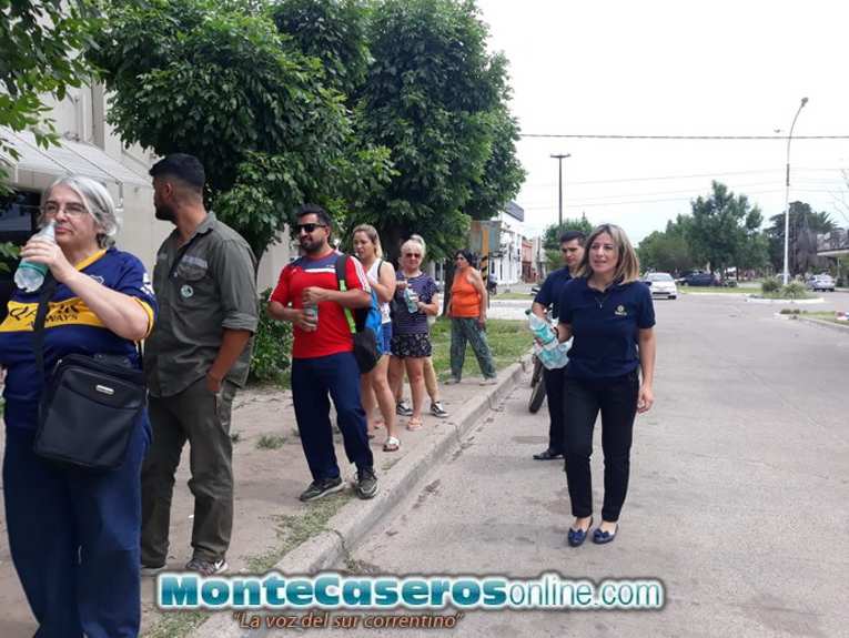 Por iniciativa de las autoridades, empleados del Banco de Corrientes, sucursal Monte Caseros repartieron, entre los usuarios que hicieron cola para utilizar los cajeros automáticos, botellas de agua fresca.