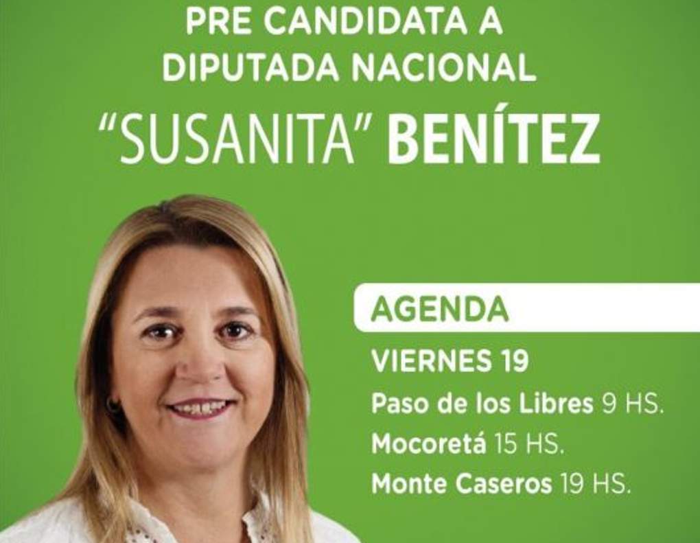 Según su agenda política Susana Benítez, estará en Paso de los Libres este viernes a las 09:00 hs, luego en Mocoretá a las 15:00hs y finalmente en Monte Caseros a las 19:00hs.