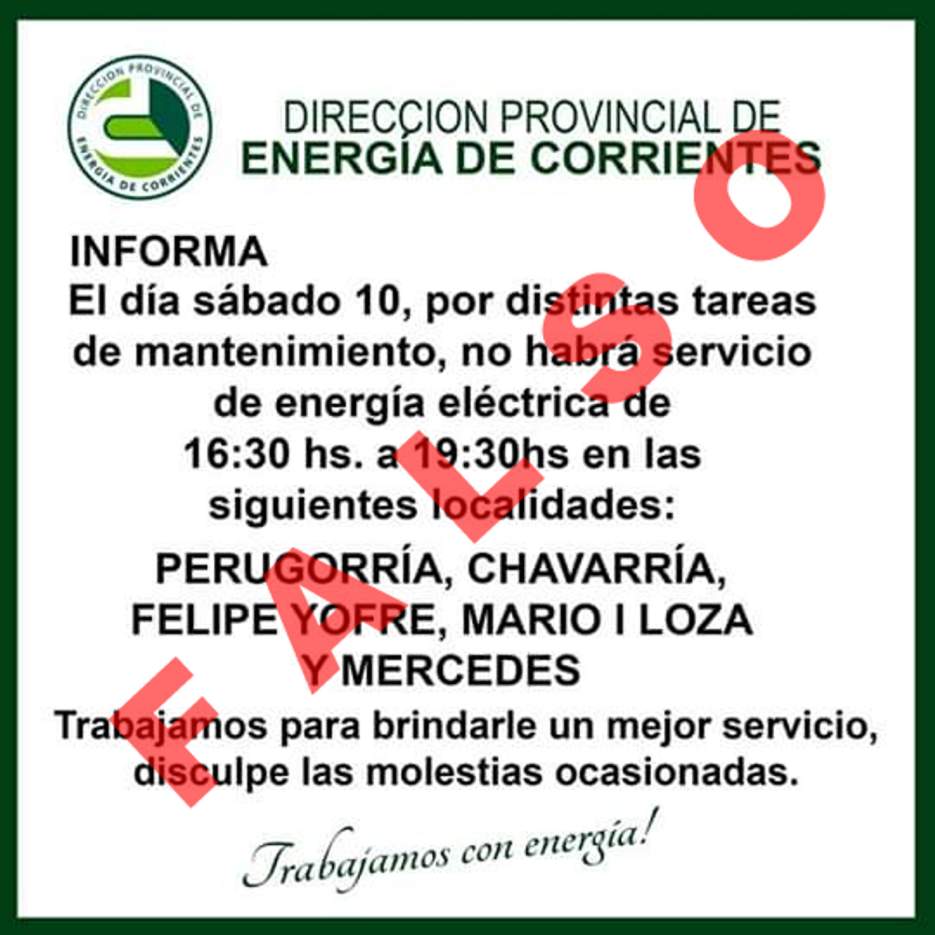 La Dirección Provincial de Energía de Corrientes desmintió que se vaya a realizar un corte de energía este sábado.