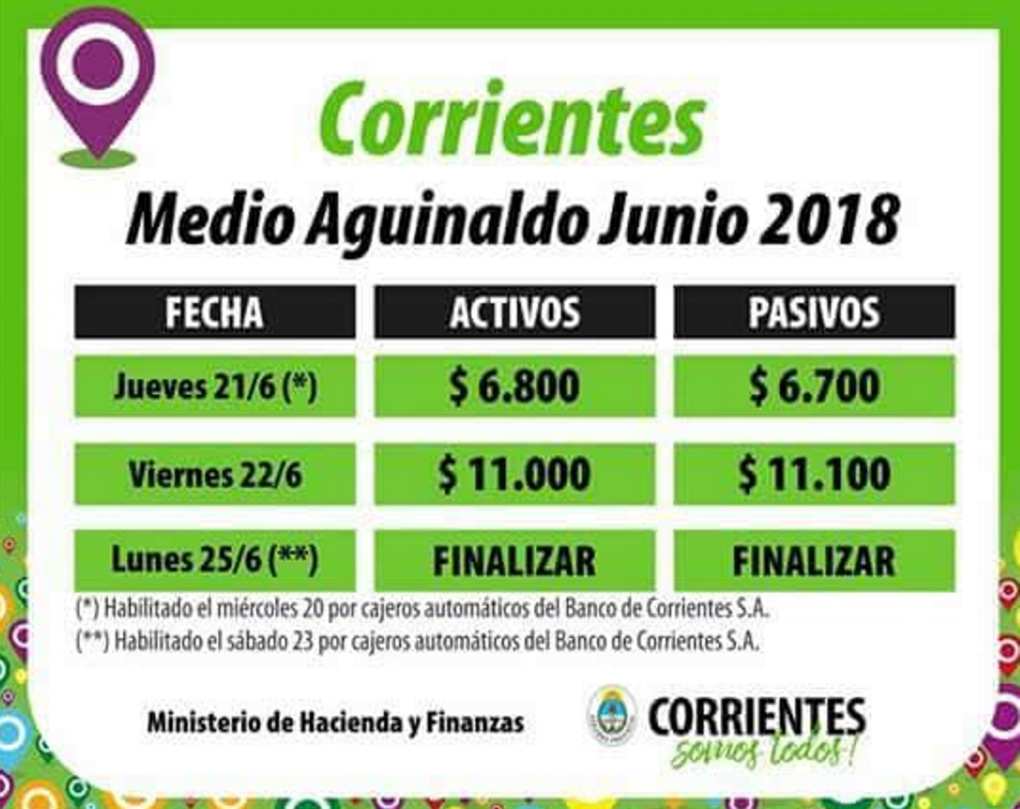 Anunciado por el gobernador Gustavo Valdés, el jefe de la cartera económica correntina Enrique Vaz Torres confirmó que el pago de la primera cuota del SAC 2018 significará una inversión de 870 millones de pesos. “Este jueves 21 se abonará a los agentes activos que perciban el medio aguinaldo hasta $6.800, y jubilados y pensionados hasta $6.700; este tramo estará disponible en los cajeros habilitados por el Banco de Corrientes desde el miércoles 20. El viernes 22, cobrarán los agentes activos hasta $11 mil, y jubilados y pensionados hasta $11.100. La liquidación de la primera cuota del SAC 2018 culminará el lunes 25, tramo que estará disponible por cajeros automáticos el sábado 23”,...