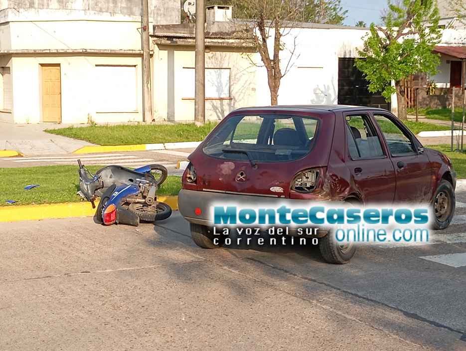 Un nuevo siniestro vial se registró en la ciudad de Monte Caseros. Un automóvil y una motocicleta protagonizaron un accidente de tránsito en la intersección de Tucumán y San Martín.